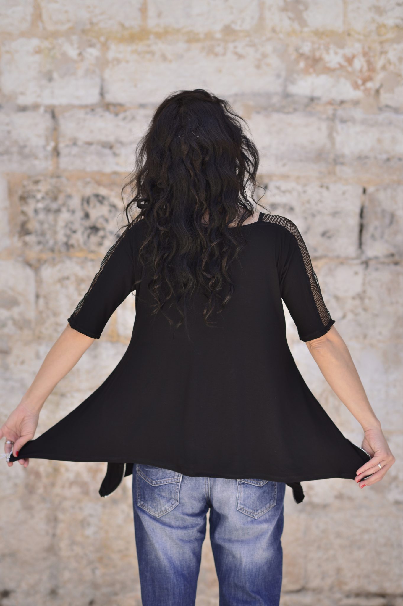 Dekonstruirana majica od prirodnog materijala. Bočno urezani džepovi, aplikacije od mrežice i patenti čine je atraktivnom. Dolazi u crno boji.
