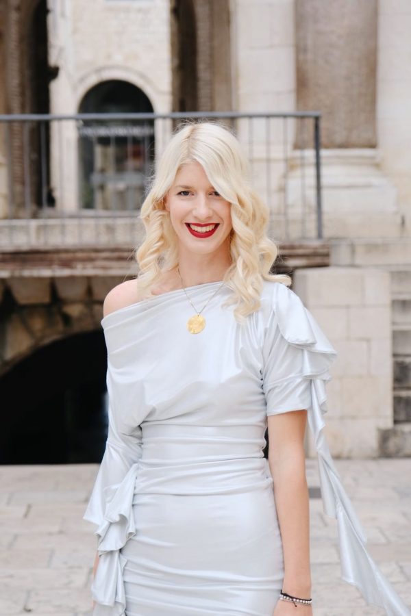 Srebrna atraktivna haljina. Prati liniju tijela i pogodna je za večernje izlaske li svečanosti.